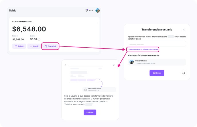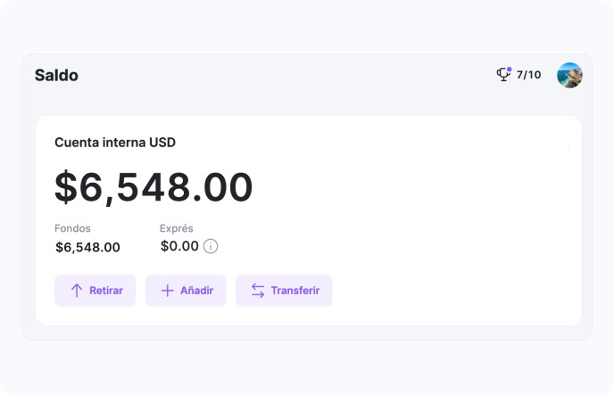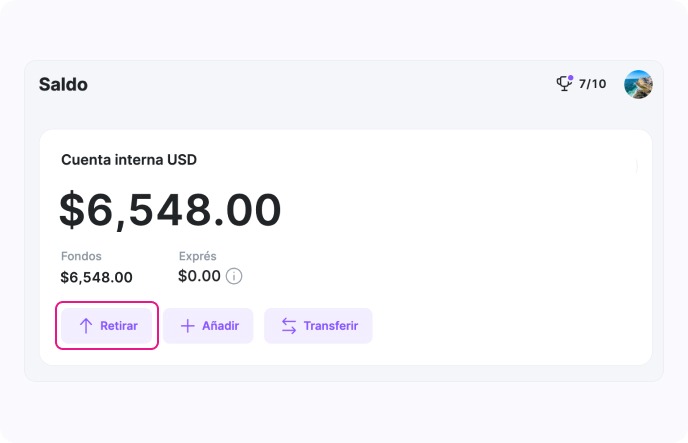 En la tarjeta de saldo, haz clic en el botón «Transferencia» para realizar una transferencia desde tu cuenta interna.