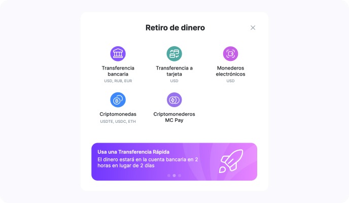 Retirada de fondos: retiro de dinero a tu cuenta bancaria, monedero electrónico o monedero cripto;