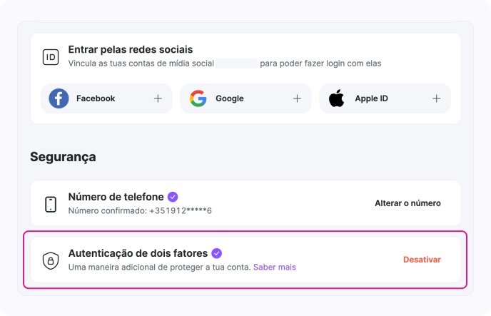 Para desativar a 2FA, vá a «Definições» → «Segurança» → «Autenticação de dois fatores» → «Desativar 2FA».