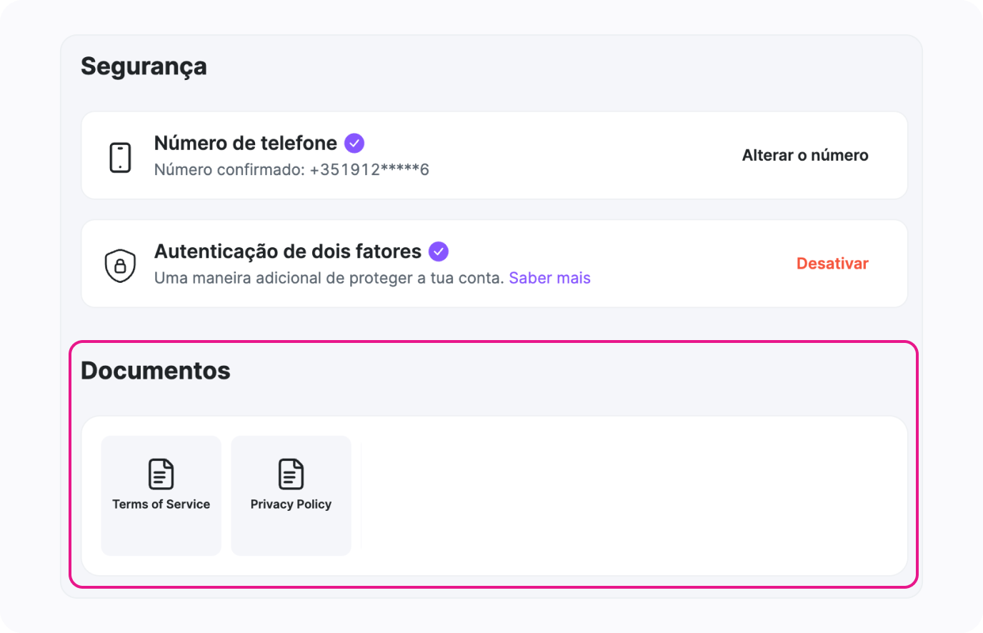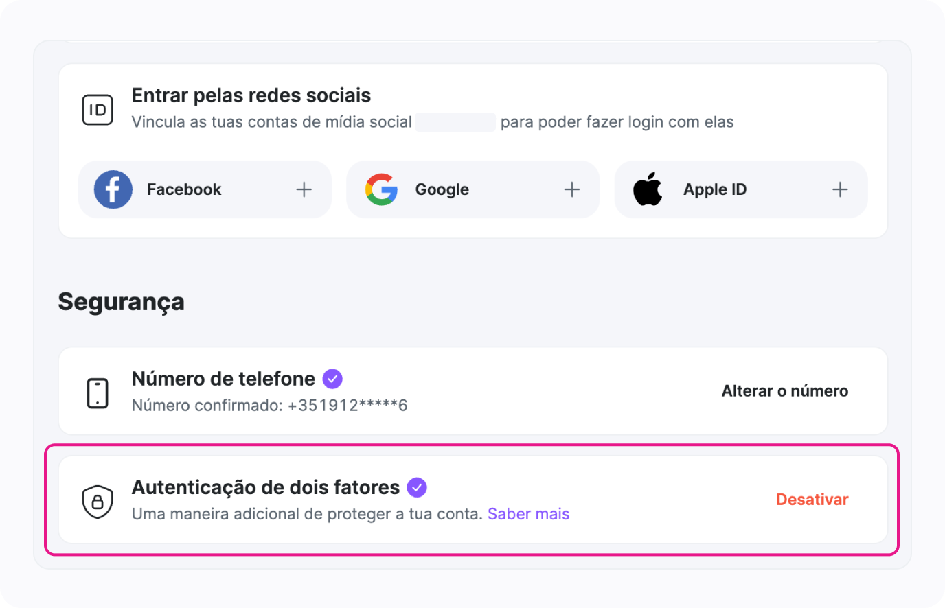 Aqui pode configurar a proteção da sua conta: ativar a autenticação de dois fatores (2FA) e associar um número de telefone atualizado. Estas medidas aumentam a segurança contra fraudes e acessos não autorizados.