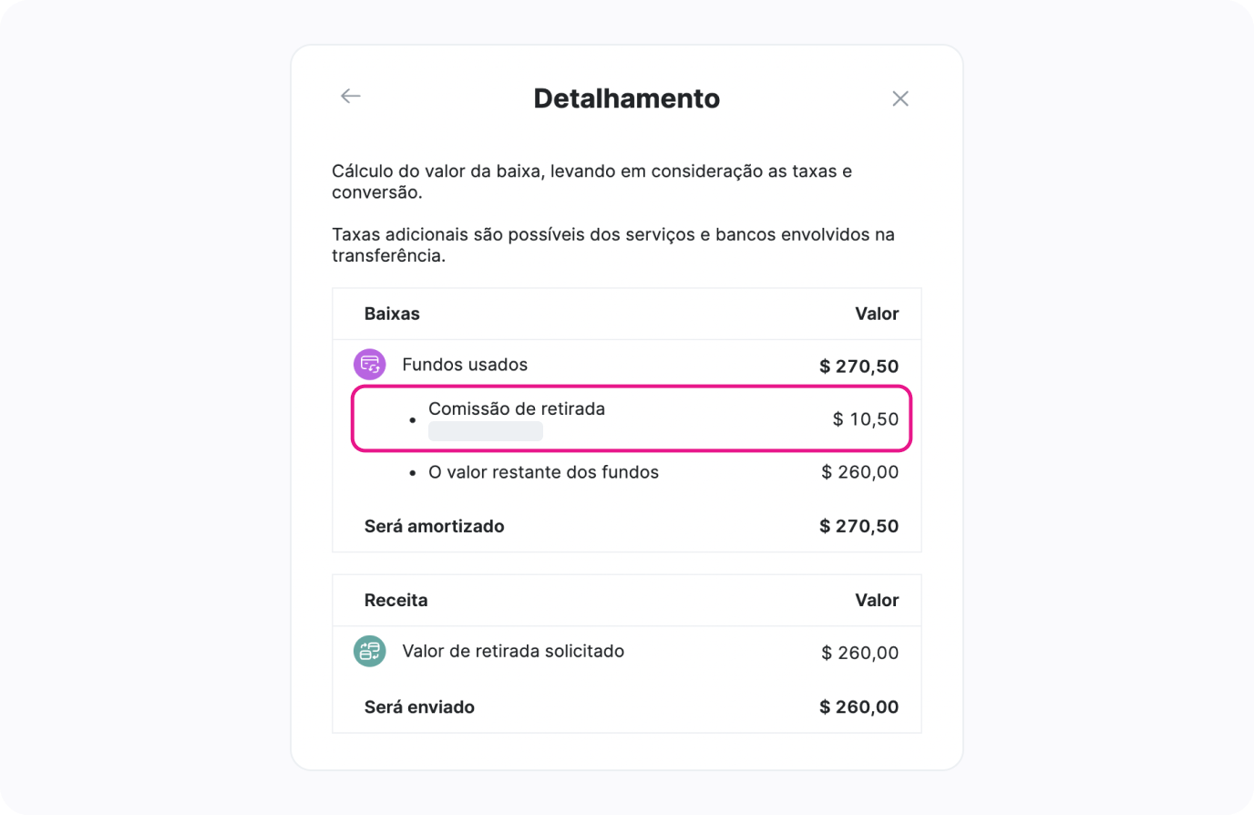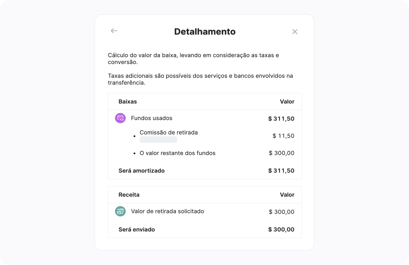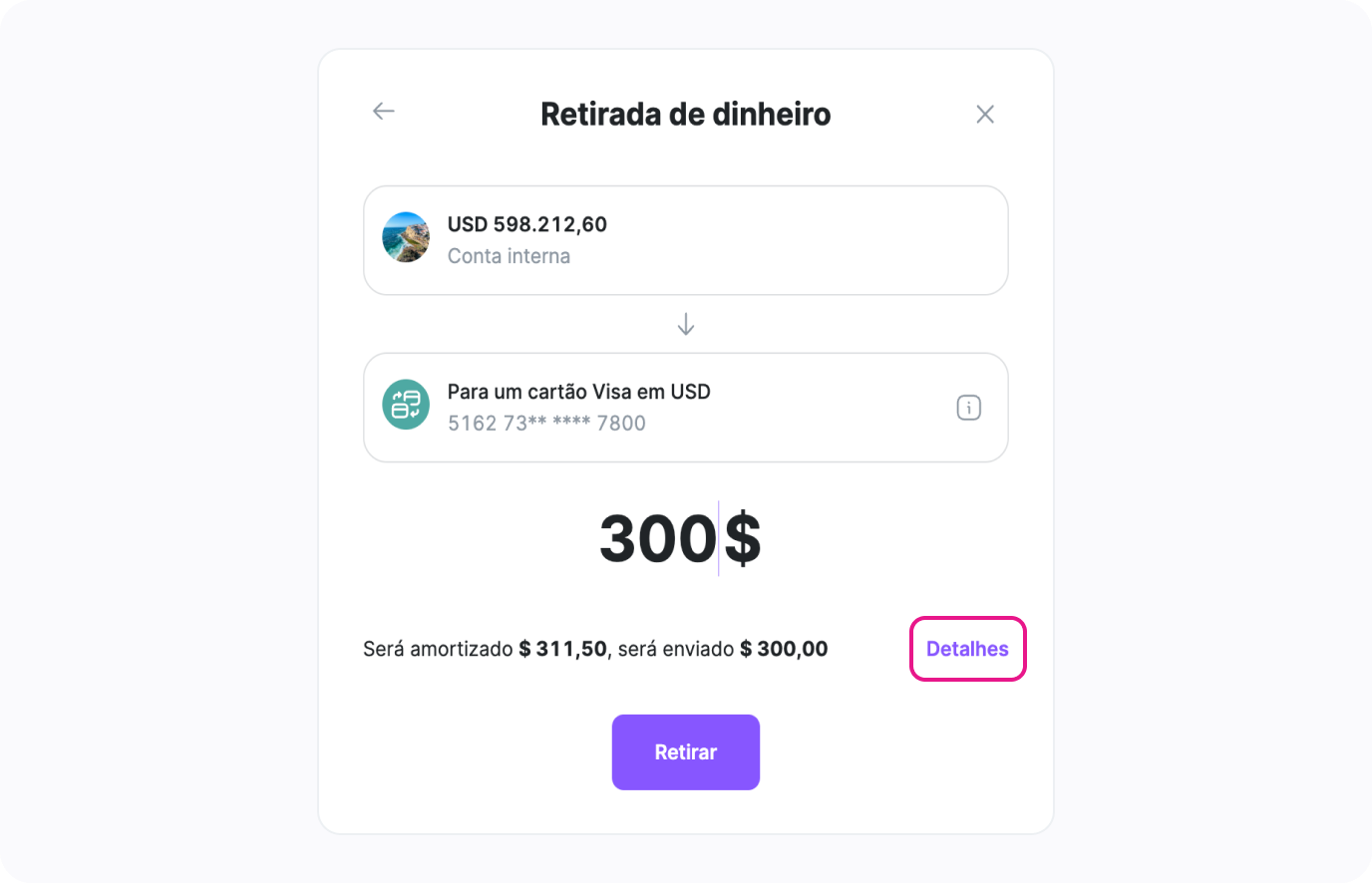 Para isso, abra a janela «Retirar fundos», introduza o valor desejado e clique em «Detalhes».