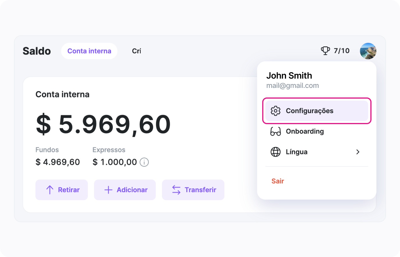 Nesta seção, é possível configurar a sua conta, reforçar a segurança e consultar o histórico de atividade.Para aceder, clique na sua foto de perfil no canto superior direito — será aberta uma barra com opções.