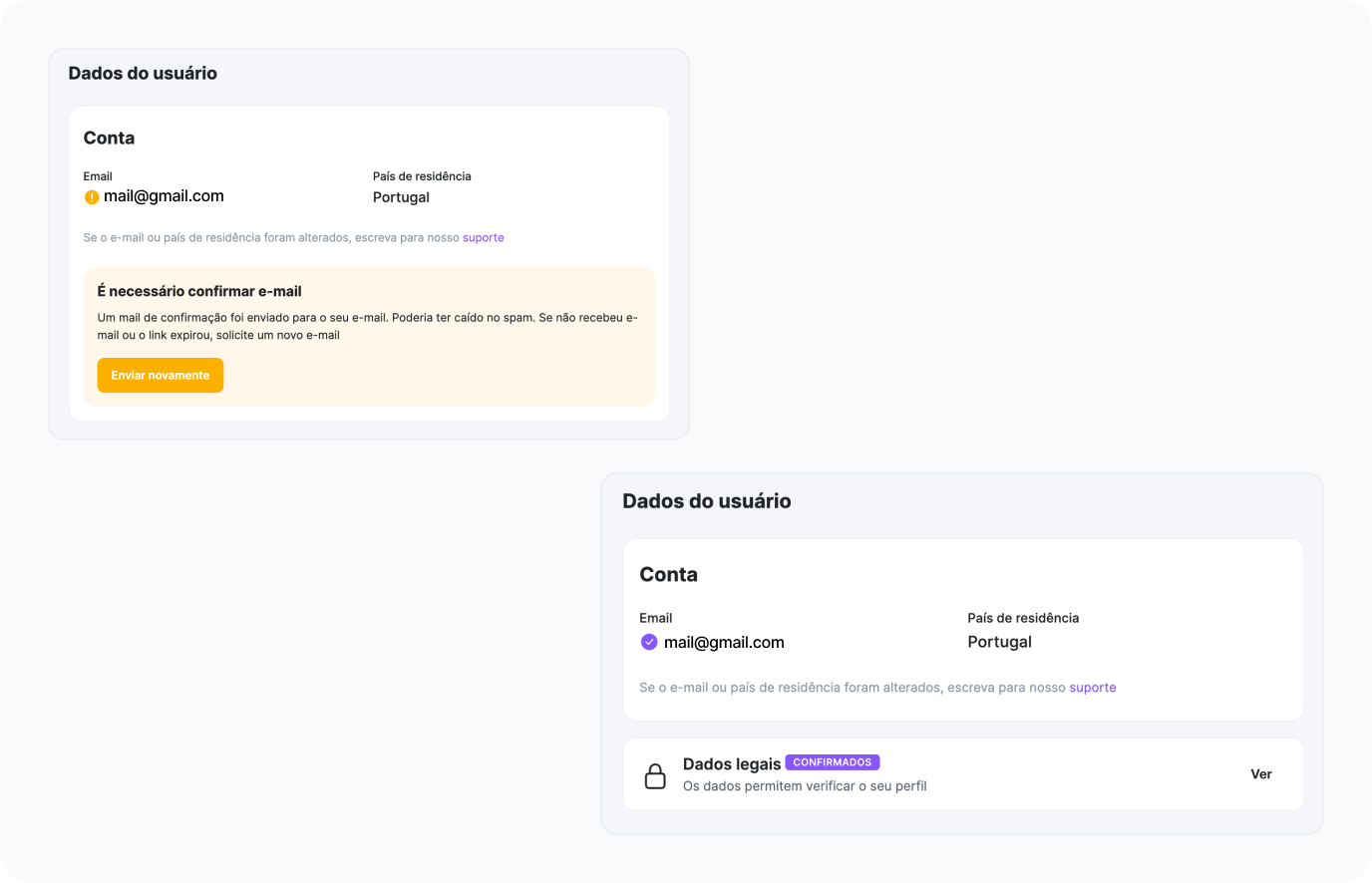 Aqui são exibidos o seu email atual e país de residência. Estes dados não podem ser alterados diretamente.