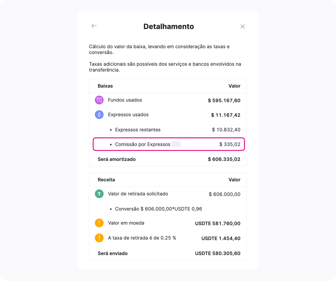 Se não quiser utilizar os Expressos, reduza o valor da retirada para não ultrapassar o saldo disponível.