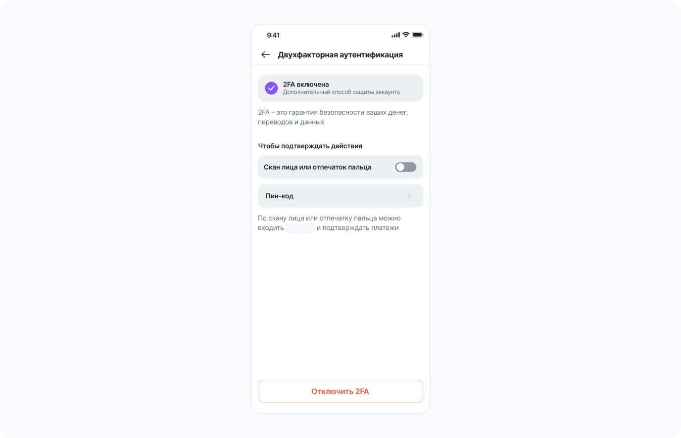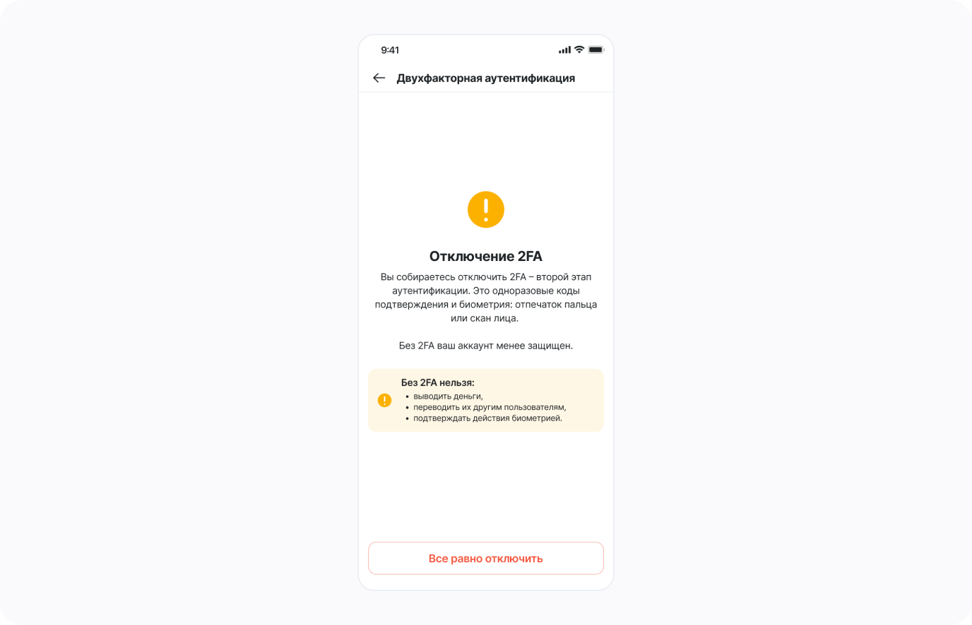 Но помните, что без двухфакторной аутентификации вы не сможете выводить и переводить средства. Да, 2FA требует дополнительных действий при входе, но гарантирует безопасность ваших денег, переводов и данных.