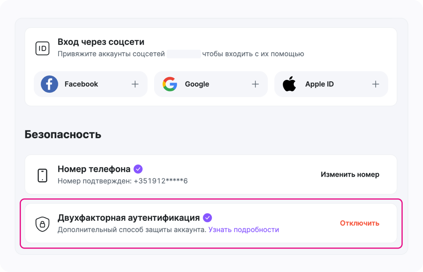 После включения 2FA вы можете подтверждать свой вход в аккаунт с помощью кода — мы отправим его на ваш номер, указанный в профиле. Без доступа к телефону войти в систему невозможно, а мошенникам гораздо сложнее попасть в ваш аккаунт.