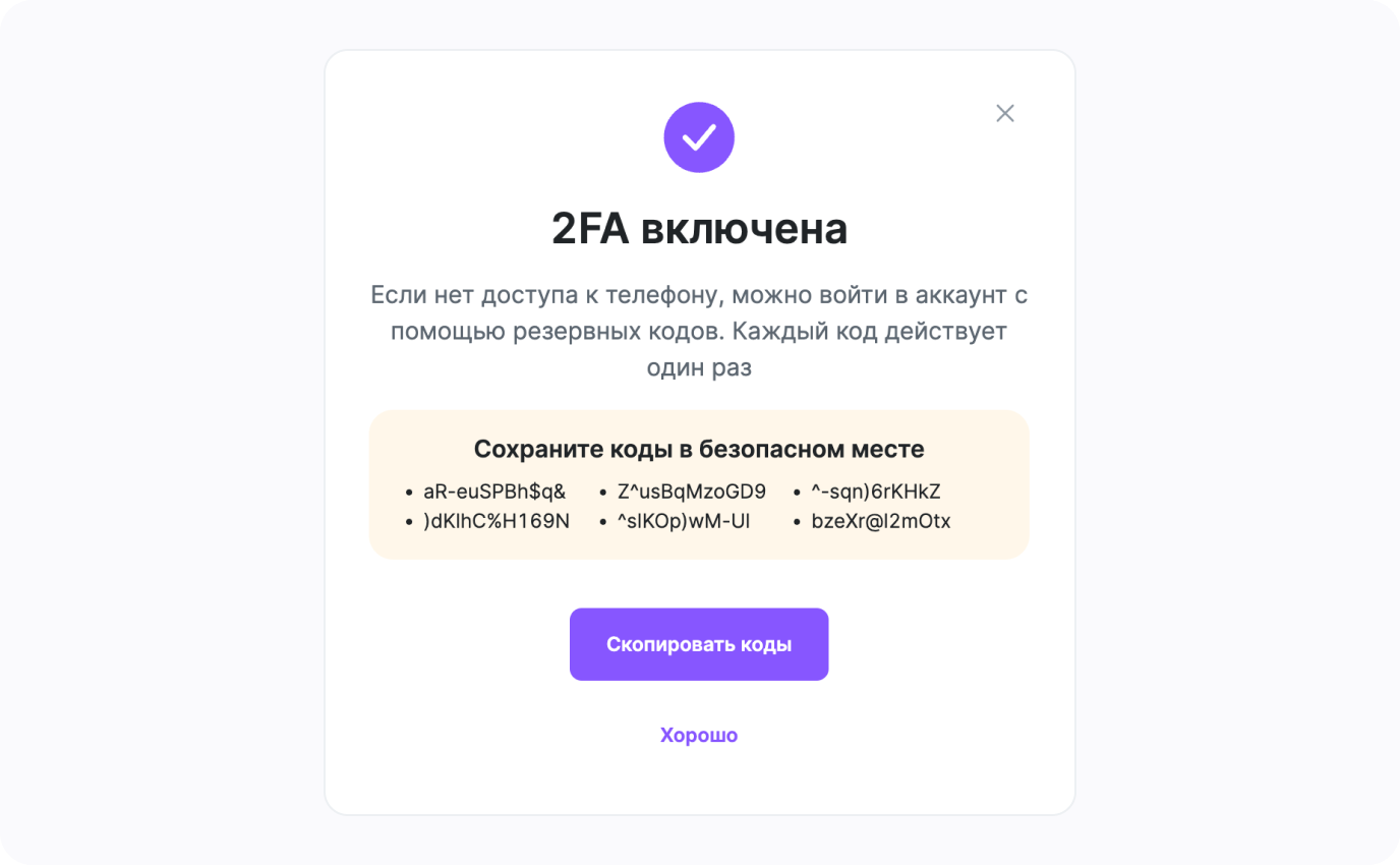 Резервные коды сообщаются только вам и только в момент включения 2FA. Поэтому обязательно скопируйте и сохраните их в безопасном месте.