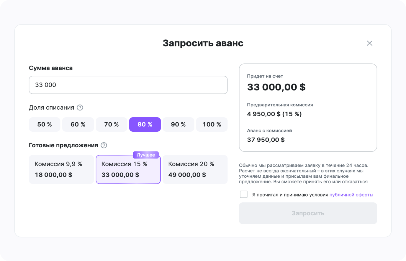 Справа вы увидите сумму для поступления на счет, предварительную комиссию и аванс с комиссией по выбранным условиям. Выберите нужный вариант, если все устраивает — примите оферту, проставив галочку в нужном поле и нажмите на кнопку «Запросить»;