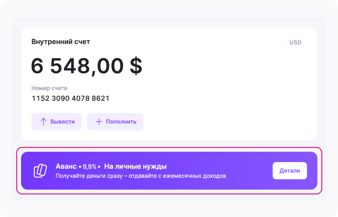 1.На главной странице MC Pay перейдите в блок «Аванс» и нажмите на кнопку «Посмотреть» или «Детали»;