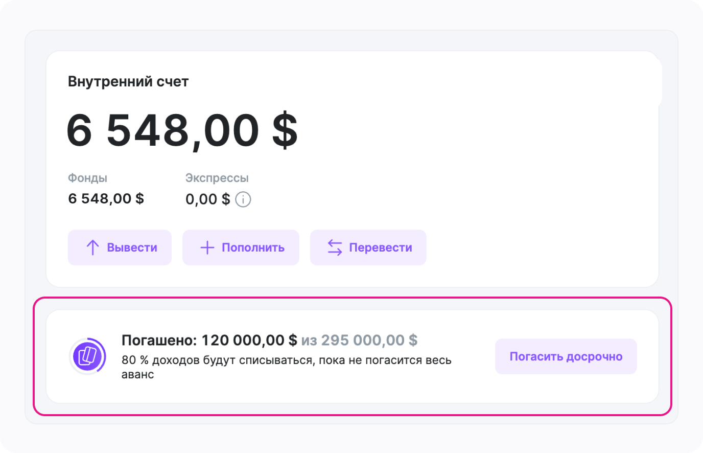 После получения денег часть вашего ежемесячного дохода будет списываться в счет погашения аванса. Вы можете выбрать удобный процент списания на этапе принятия предложения об авансе.
