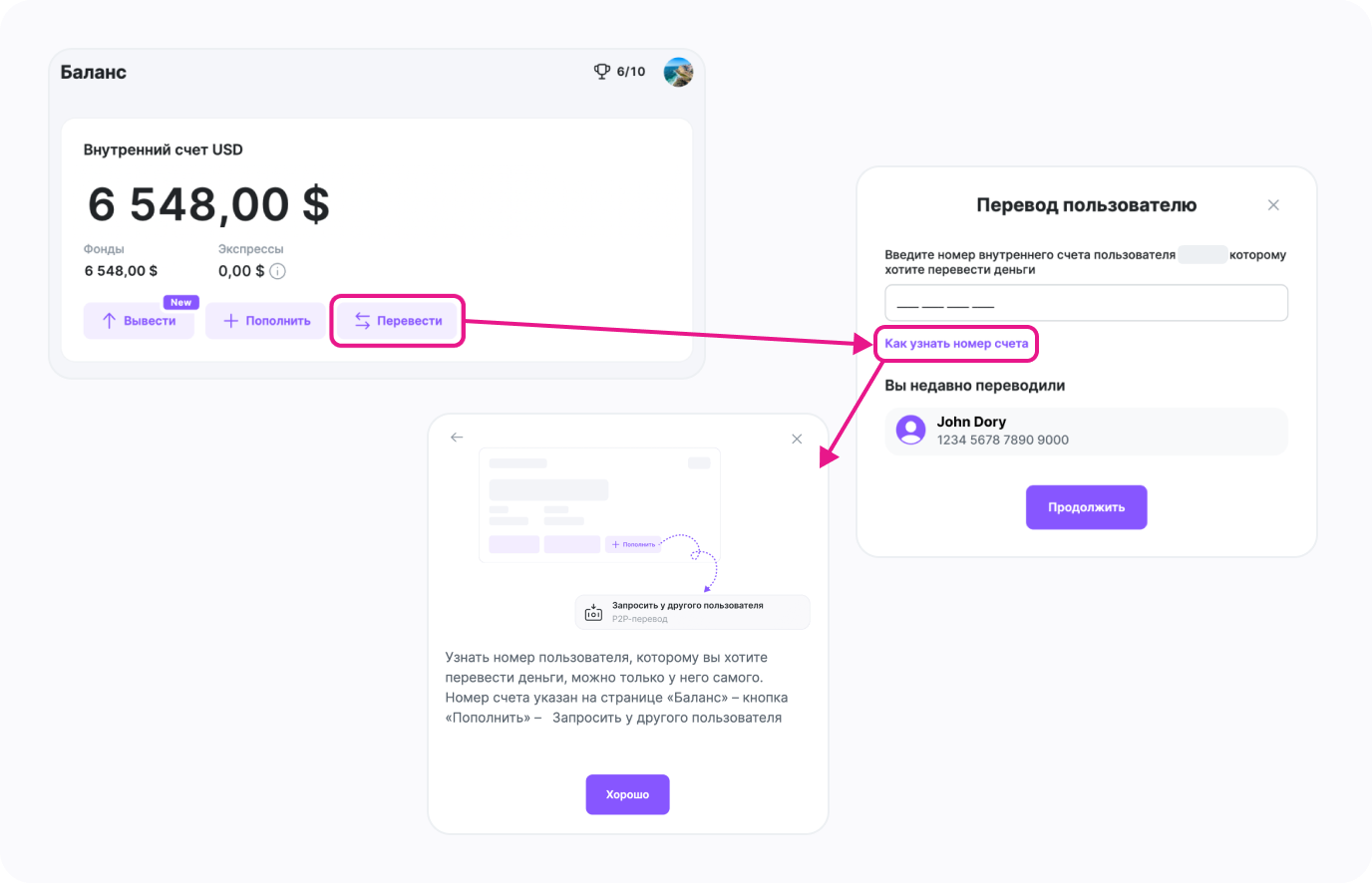 Откроется окно ввода номера счета нужного пользователя. Введите номер, а если не знаете его — нажмите на «Как узнать номер счета». Затем следуйте указанным шагам