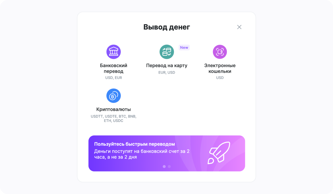 Вывод средств — вывод денег на ваш банковский счет, электронный или крипто кошелек;