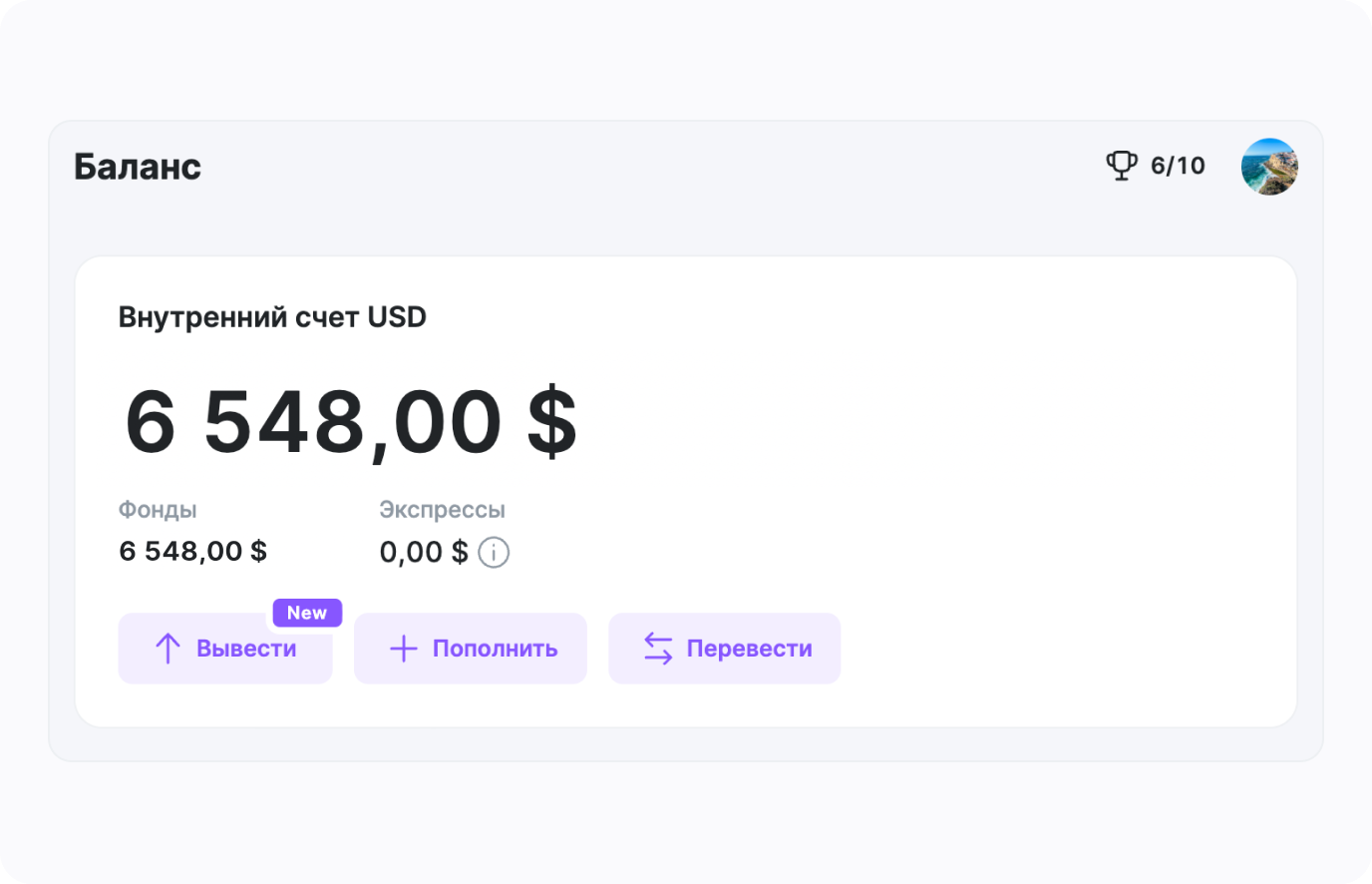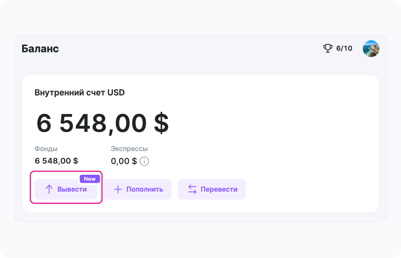 В карточке баланса нажмите на кнопку «Перевести», чтобы выполнить перевод с вашего внутреннего счета.