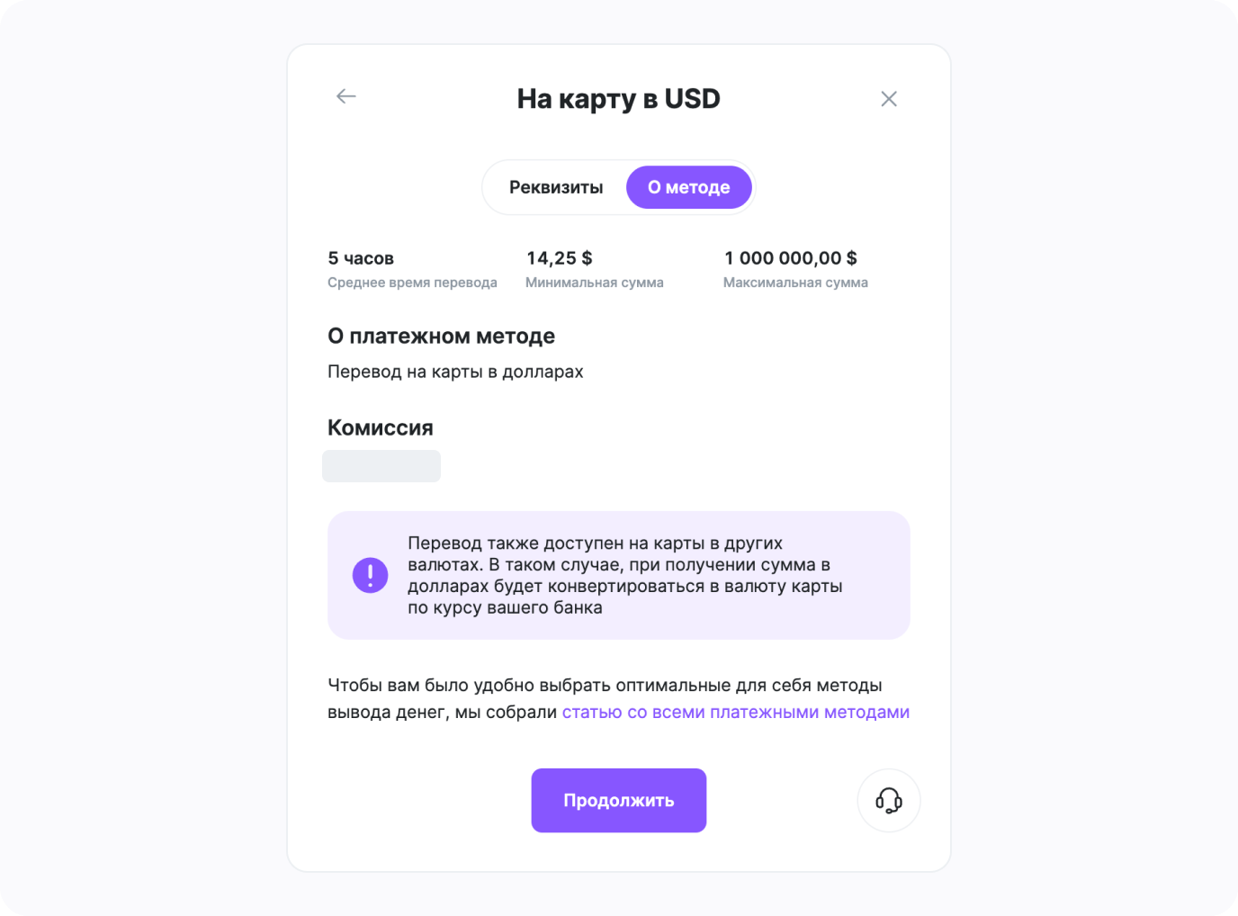 Откроется окно метода — в нем можно узнать о методе и комиссии, а также внести нужные реквизиты. Внесите реквизиты, чтобы вывести деньги.